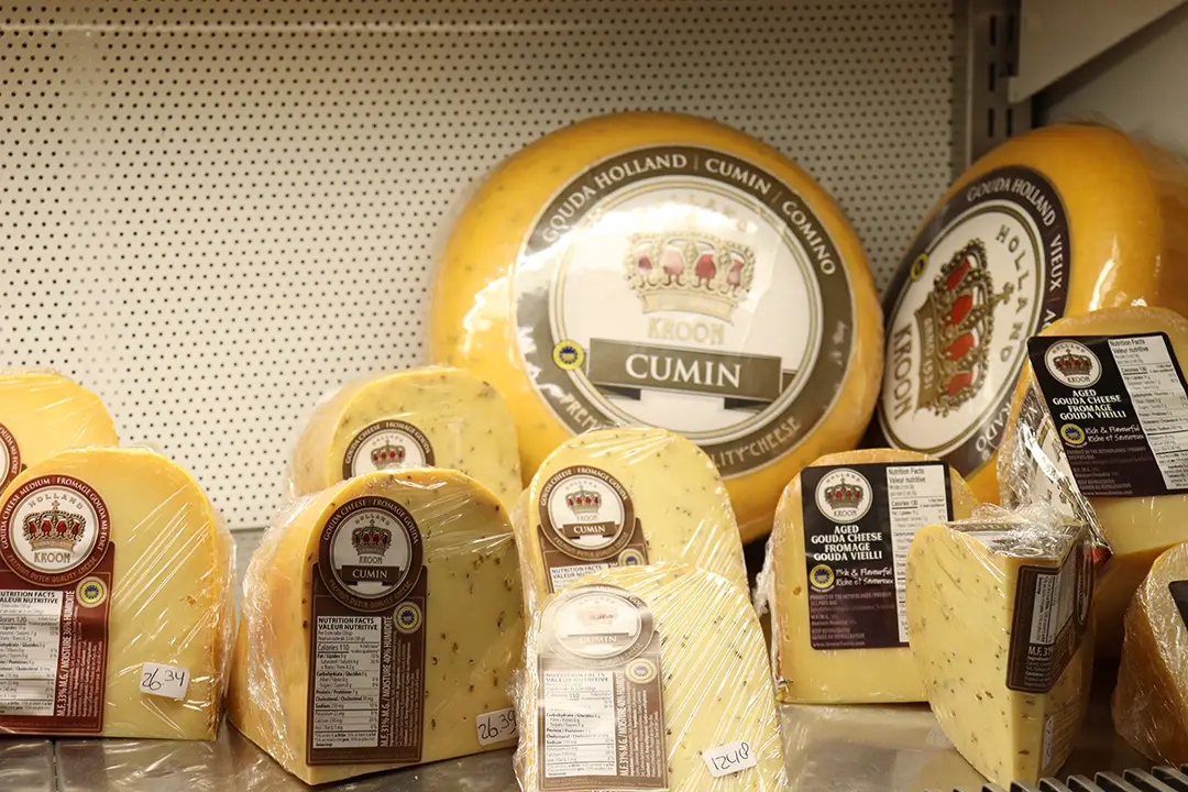 Large wheels and small wedges of cheese, wrapped in plastic labeled “cumin.”