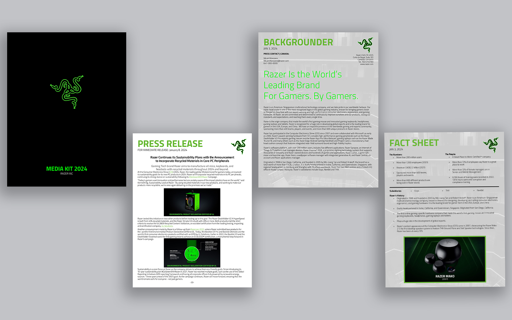 Writing and design for a media Kit concept based on CES 2024 news for Razer, a technology and lifestyle brand.