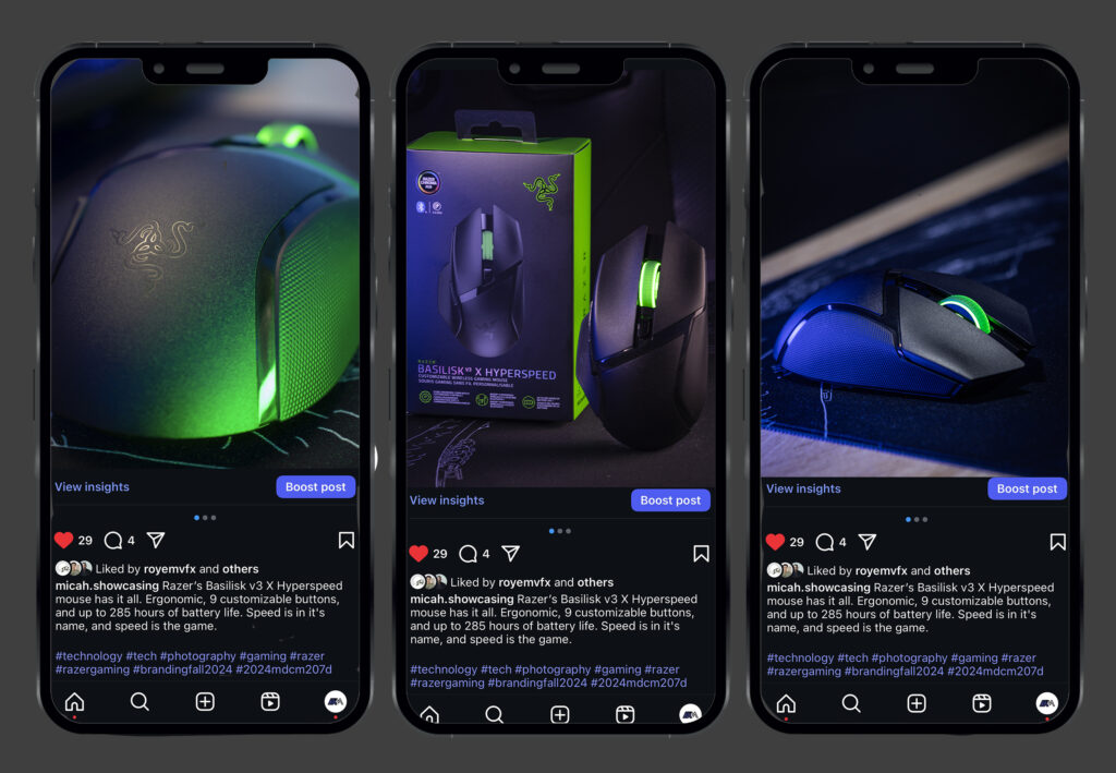 I have also designed concept Instagram ads and a Magazine ad for Razer. further testing my designing and photography skills.